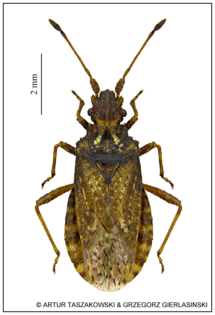 Wierzch ciała barwy od jasno- do ciemnobrązowej, miejscami czarny; spód brunatny. Powierzchnia całego ciała (z wyjątkiem półpokryw), pokryta licznymi guzkami. Kolce u nasady czułków wyraźne, skierowane do przodu i silnie zagięte do wewnątrz. Nadustek szeroki. Trzy pierwsze człony czułków barwy ciała, czwarty czarny; pierwszy człon pokryty licznymi guzkami; drugi węższy niż pierwszy. Przedplecze trapezoidalne, u niektórych osobników w części środkowej czarne; przednie i tylne kąty przedplecza tępe; krawędź boczna nieregularna z wyraźnymi odstającymi guzkami. Przedplecze rozszerzone w 1/3 swojej długości od podstawy z dwoma dobrze wykształconymi białymi pasami narośli przypominającymi pęcherzyki. Tarczka lekko wklęsła, podzielona podłużnym żeberkiem na dwie równe części; krawędzie boczne ciemniejsze od części środkowej; szczyt zaokrąglony, jasny lub ciemny. Membrana szara, jej żyłki białe z czarnymi przebarwieniami. Segmenty listewki odwłoka dwubarwne: ciemne przy przedniej i tylnej krawędzi z jasną wstawką między nimi. Odnóża barwy ciała. Długość ciała 6-6,5 mm. Występuje na terenach suchych i dobrze nasłonecznionych, pokrytych niezbyt gęstą roślinnością. Podstawową rośliną pokarmową jest iglica, ale gatunek ten znajdowany jest również pod janowcem barwierskim, żarnowcem, wrzoścem, wrzosem, farbownikiem, nicennicą, kocankami piaskowymi, wilczomleczem, macierzanką, bylicą polną, śliwą tarniną. Niekiedy larwy żerują na lucernie nerkowatej i kolczasto-strąkowej, koniczynie polnej i różnoogonkowej, oraz pięciorniku.