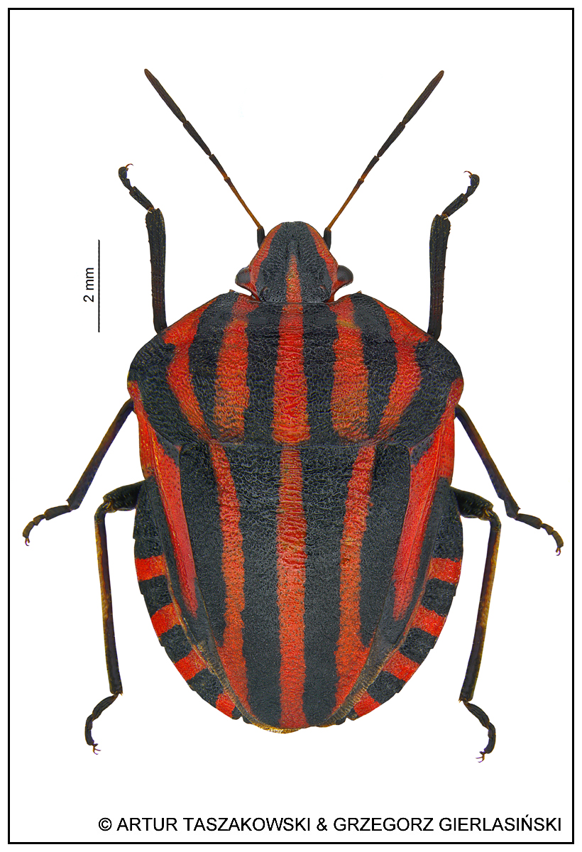 Ciało 8,0-12,0 mm długości, w podłużne czarne i czerwone pasy, gęsto punktowane drobnymi punktami. Głowa z dwoma, przedplecze z sześcioma, a tarczka z czterema czarnymi pasami; listewka brzeżna odwłoka również w czarno-czerwone pasy. Czułki zazwyczaj całe czarne, czasami mniej lub bardziej czerwonawe; ich drugi człon wyraźnie dłuższy od trzeciego. Dolna strona ciała jasnoczerwona, z licznymi czarnymi plamami. Odnóża czerwono-czarne, często z przewagą koloru czarnego. W naszym kraju dosyć pospolity (nie spotykany tylko wysoko w górach), reprezentowany przez podgatunek G. lineatum italicum (podgatunek nominatywny występuje w basenie Morza Śródziemnego). Żyje na dużych baldaszkowatych (Apiaceae) rosnących w ciepłych, zazwyczaj silnie nasłonecznionych biotopach, zarówno o charakterze typowo łąkowym, jak i ruderalnym. Do najczęstszych roślin żywicielskich należy marchew zwyczajna (Daucus carota L.), pasternak zwyczajny (Pastinaca sativa), dzięgiel leśny (Angelica silvestris), barszcz zwyczajny (Heracleum sphondylium). gorysz pagórkowy (Peucedanum oreoselinum) i trybula leśna (Anthriscus silvestris). Zimują owady dorosłe pod opadłymi liśćmi i w detrytusie roślinnym, nowe pokolenie pojawia się w naszym kraju już w lipcu.