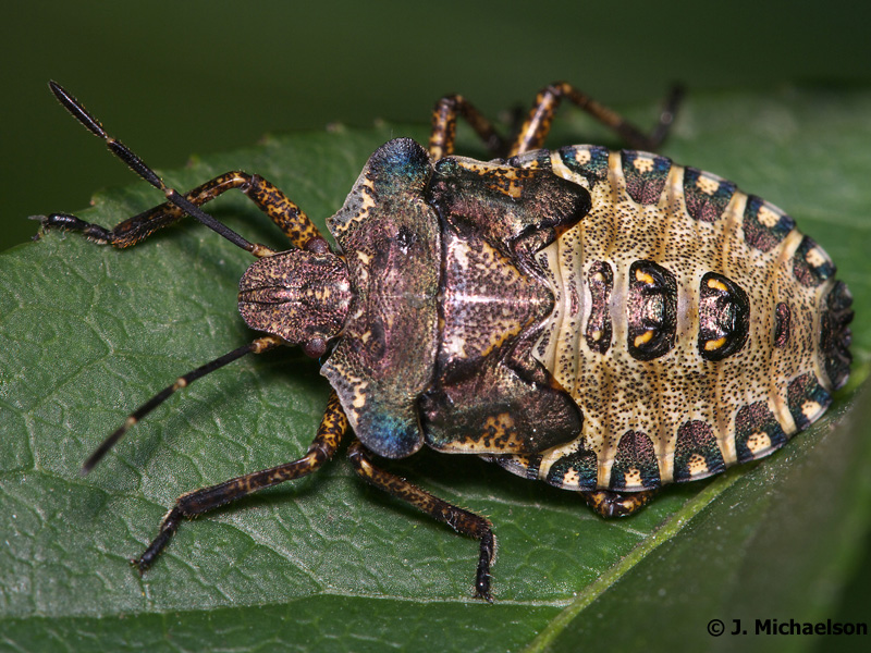 Długość ciała 13.0-16.0 mm; jego ubarwienie żóhobrązowe, na stronie grzbietowej z dużą ilością ciemnych punktów i plam, przez co osobniki wydają się na pierwszy rzut oka ciemnobrązowe lub nawet brązowoczame; głowa, przednia część przedplecza i tarczki, oraz nasada półpokryw często z zielonawym, metalicznym połyskiem. Czułki i odnóża od zółtobrązowych, poprzez czerwone do czerwonobrązowych, pazurki stóp czarne. Nadustek wyraźnie krótszy od policzków, często na szczycie całkowicie przez nie zakryty. Boczne rogi przedplecza bardzo gęsto punktowane i ciemniejsze od jego reszty. Szczytowa część tarczki niepunktowana lub bardzo słabo punktowana, żółta, żółtobrązowa lub czerwona, wyraźnie różniąca się od pozostałej powierzchni tarczki. Błonka półpokryw półprzeźroczysta, jednolicie brązowa. Gatunek eurosyberyjski. Fitofag, ale często nakłuwa i wysysa inne drobne owady oraz ich larwy, a czasami nawet jaja złożone przez samice własnego gatunku. Zimuje postać larwalna (nimfa II lub III stadium) zazwyczaj w szczelinach drzew, pod korą, w dziuplach, w mchu i pod liśćmi u nasady pni. W Polsce gatunek pospolity na terenie całego kraju, spotykany zazwyczaj na różnych gatunkach drzew i krzewów, głównie liściastych.