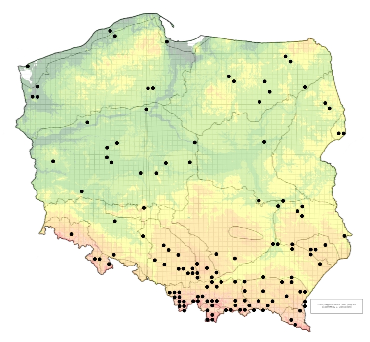 Babia Góra, Stokówka (CV99, Hebda et al. 2020a), Babia Góra (CV99, Stobiecki 1915), Barcice (DV78, Stobiecki 1915), Białka, Maryniaki (DA00, Hebda et al. 2020a), Bieńkowice (DA32, Smreczyński 1906b), Bystra, II (CA51, Gierlasiński 2020), Cieszyn, Krasna (CA31, Gierlasiński et al. 2020b), Głogoczów (DA12, Stobiecki 1915), Góra Bucze (CA41, Gierlasiński et Fiedor 2021a), Kamesznica (CV59, Gierlasiński et al. 2023), Klimkówka (EV08, Gierlasiński et al. 2020a), Korbielów (CV89, Lis B. et Lis J.A. 2009), Krynica (DV97, Smreczyński 1954), Lachowice (CA90, Smreczyński 1954), Maków Podhalański (DA00, Smreczyński 1954), Masyw Czantorii Wielkiej (CA40, Kędzior et al. 2012), Milówka (CV69, Gierlasiński 2020), Nickulina (CV68, Gierlasiński 2020), Niedźwiedź, I (DV39, Smreczyński 1910b), Nowy Sącz (DV79, Smreczyński 1954), Poręba Wielka (DV39, Smreczyński 1910b), Ptaszkowa (DV99, Stobiecki 1915), Raba Wyżna (DV29, Stobiecki 1915), Rabka (DV29, Smreczyński 1954), Rycerka Górna (CV58, Gierlasiński 2020), Rytro (DV78, Stobiecki 1915), Rzeczanów (DV78, Stobiecki 1915), Sieniawa, II (DV28, Stobiecki 1915), Skawa (DV29, Lis J.A. 1990a), Słotwina (DA73, Smreczyński 1954), Soblówka (CV67, Gierlasiński et al. 2023), Stary Groń (CA50, Matuszczyk et Taszakowski 2017), Szczyrk (CA50, Gierlasiński et al. 2020a), Toporzysko (DV19, Stobiecki 1915), Wisła, Malinka, I (CA50, Gierlasiński et al. 2023), Wrząsowice (DA23, Stobiecki 1915), Zawoja, Barańcowa (CV99, Lis J.A. 1990a), Złatna (CV68, Gierlasiński et al. 2023), Żegiestów (DV87, Smreczyński 1954)
