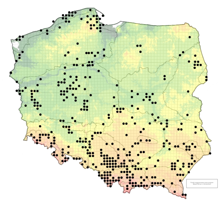 Balice (DA14, Gierlasiński et al. 2020a), Czatkowice (DA05, Lis J.A. 1990a), Czerna (DA05, Stobiecki 1886), Dębnik, II (DA05, Gierlasiński et al. 2021a), Kraków, Bagry (DA24, Gierlasiński et al. 2022a), Kraków, Bielany (DA14, Stobiecki 1886, Smreczyński 1906b), Kraków, Błonia (DA24, Stobiecki 1886), Kraków, Bronowice (DA14, Gierlasiński et al. 2020a), Kraków, Nowa Wieś (DA24, Smreczyński 1906b), Kraków, Panieńskie Skały (DA14, Stobiecki 1886, Smreczyński 1906b), Kraków, Przegorzały (DA14, Stobiecki 1886), Kraków, Rżąka (DA23, Smreczyński 1906b), Kraków, Sikornik, I (DA14, Stobiecki 1886), Kraków, Zakrzówek (DA24, Gierlasiński et al. 2022a), Kraków (DA24, Nowicki 1868, Stobiecki 1886), Krzeszowice (DA05, Stobiecki 1886), Lipna Wola (DA36, Gierlasiński et al. 2023), Ogrodzieniec, I (CA98, Gierlasiński et al. 2019b), Ojcowski PN, Dolina Sąspowska (DA16, Chłond et Gorczyca 2009), Ojcowski PN, Ojców (DA16, Lis J.A. 1990a, Chłond et Gorczyca 2009), Ojcowski PN, Okopy (DA16, Chłond et Gorczyca 2009), Ojcowski PN, Pieskowa Skała (DA16, Chłond et Gorczyca 2009), Ojcowski PN, Polana Goplana (DA16, Chłond et Gorczyca 2009), Ojcowski PN, Prądnik (DA16, Gierlasiński et al. 2020a), Ojcowski PN, Skała Jonaszówka (DA16, Chłond et Gorczyca 2009), Ojcowski PN, Skały Sucze (DA15, Chłond et Gorczyca 2009), Ojcowski PN, Wąwóz Pilny Dół (DA16, Chłond et Gorczyca 2009), Ojcowski PN, Wąwóz Smardzowicki (DA16, Chłond et Gorczyca 2009), Ojcowski PN (DA16, Klasa et al. 2010), Olsztyn, II (CB72, Lis B. et Lis J.A. 2009, Gierlasiński et al. 2025b), Przedmość, I (CB16, Noga et Lis B. 2015), Przedmość, II (CB26, Noga et Lis B. 2015), Pustynia Błędowska (CA97, Lis J.A. 1989b, Gierlasiński et al. 2020a), rez. Bonarka (DA24, Gierlasiński et al. 2020a), rez. Góra Zborów (CB90, Gierlasiński et al. 2020a, Gierlasiński et al. 2025b), rez. Kajasówka (DA04, Gierlasiński et al. 2020a), rez. Skołczanka (DA14, Gierlasiński et al. 2020a), Rudawa (DA05, Gierlasiński et al. 2023), Szczekociny (DB10, Gierlasiński et al. 2019b), Tenczynek (DA05, Smreczyński 1906b), Zabierzów (DA15, Stobiecki 1886, Smreczyński 1906b), Załęcze Wielkie (CB36, Gierlasiński et al. 2019b), Żelazko (CA98, Gierlasiński et al. 2023)